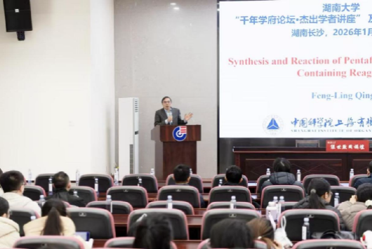2026年1月12日,中国科学院院士、中国科学院上海有机化学研究所先进氟氮材料重点实验室主任卿凤翎教授受邀作题为《五氟硫基试剂的合成与反应》主题报告。本次报告会也是“千年学府论坛·化学生物前沿杰出学者讲座”第六十六期。化学生物传感全国重点实验室、化学化工学院及相关学科两百余名师生倾听了本次讲座。